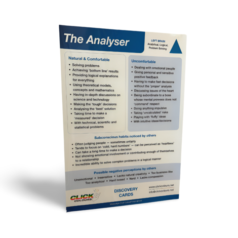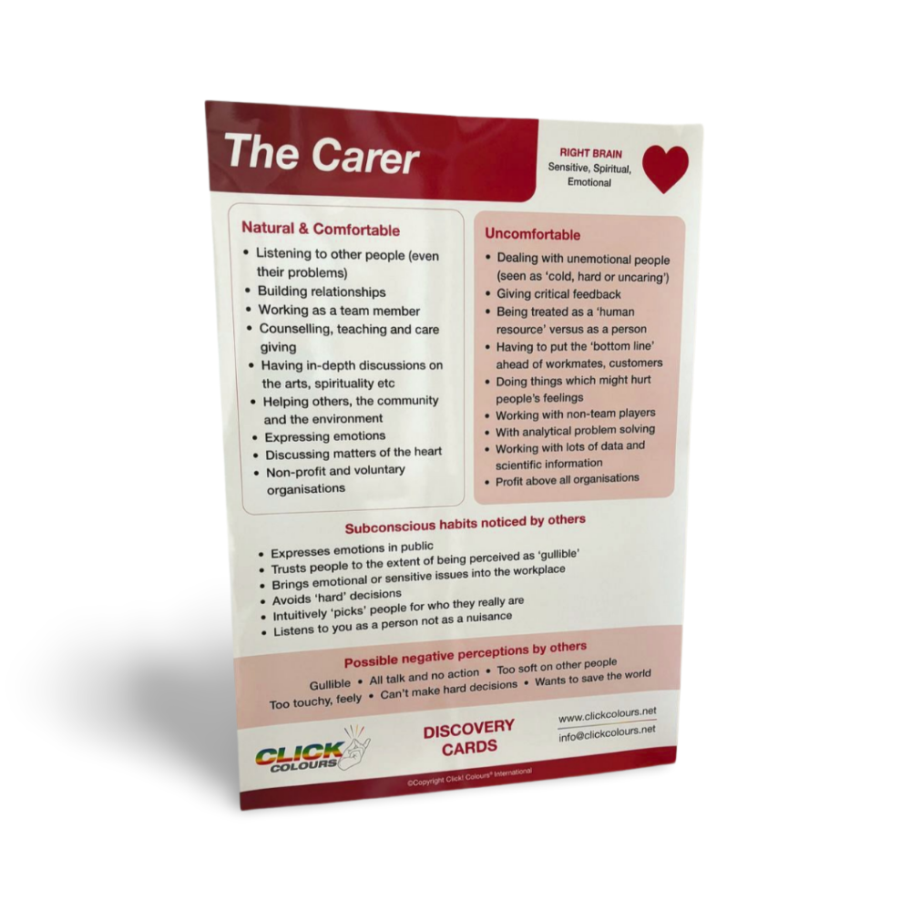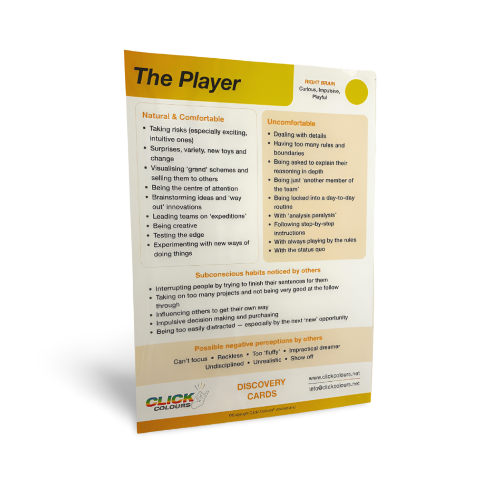 Large, laminated A2 (420mm × 594mm) versions of the Click! Colours Discovery Cards. Great visual reminders of the Click! Colours that will help your people understand and leverage diversity. Use them in your workplace or to run your own Click! Colours Workshops.